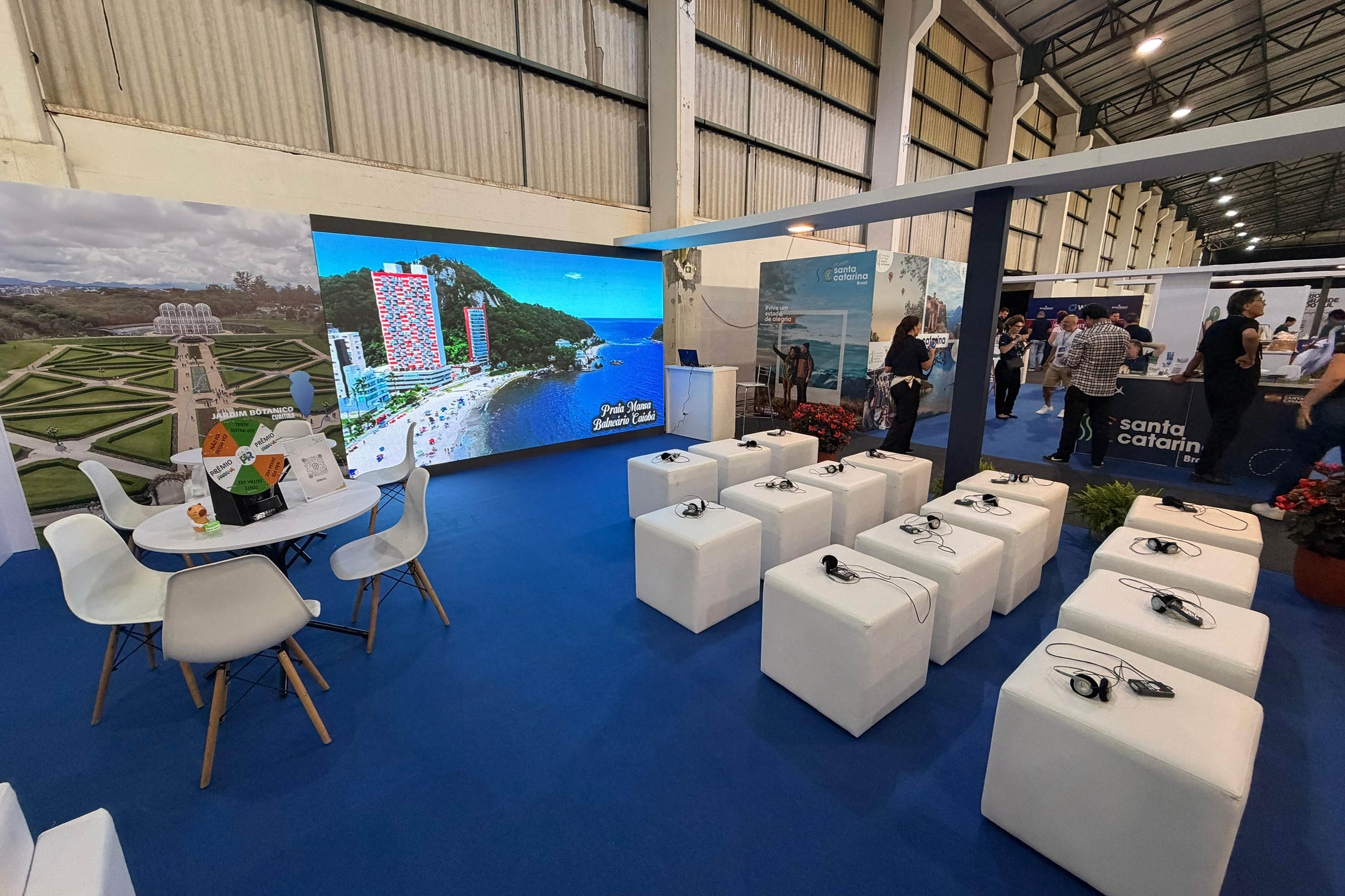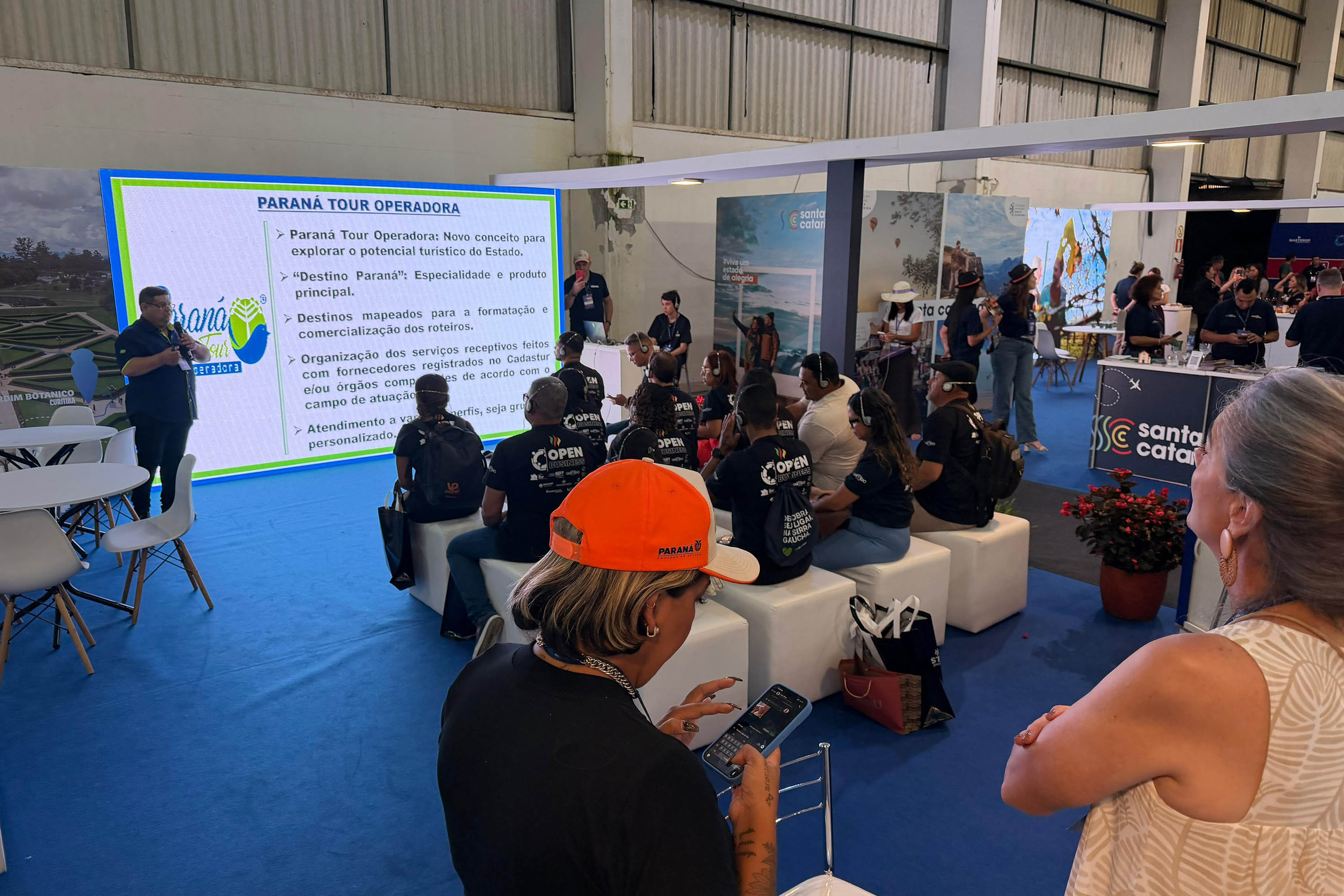 ESPAÇO QUALIFICADO - Nesta quarta, uma feira de exposições foi aberta ao público, reunindo diversos serviços, destinos, treinamentos, workshops, rodadas de negócios e muito networking. O Viaje Paraná conta com estande no pavilhão da ExpoGramado (palco da programação), com área de 90 metros quadrados, distribuídos entre totens de promoção, balcões para atendimento e espaço para apresentação de painéis.