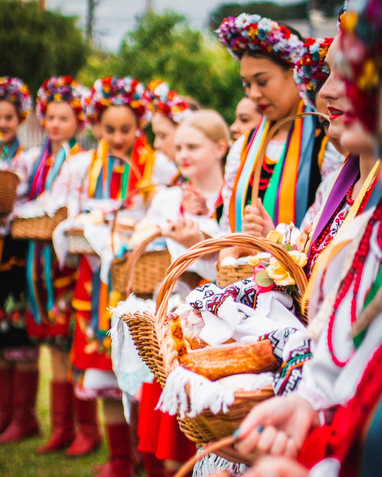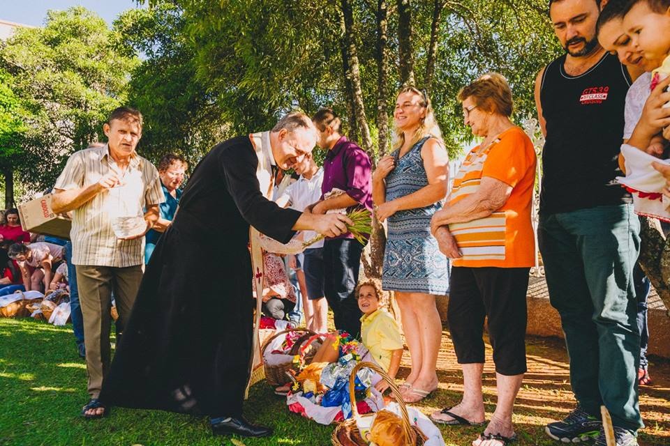 Também no sábado, a comunidade participa da benção dos alimentos e leva insumos e comidas símbolos dessa época em uma cesta, coberta com a rushnekê, uma toalha bordada. Na cesta vão itens como krin (raiz forte), paska (pão de Páscoa) e as famosas pêssankas (ovos decorados artesanalmente pelas famílias).