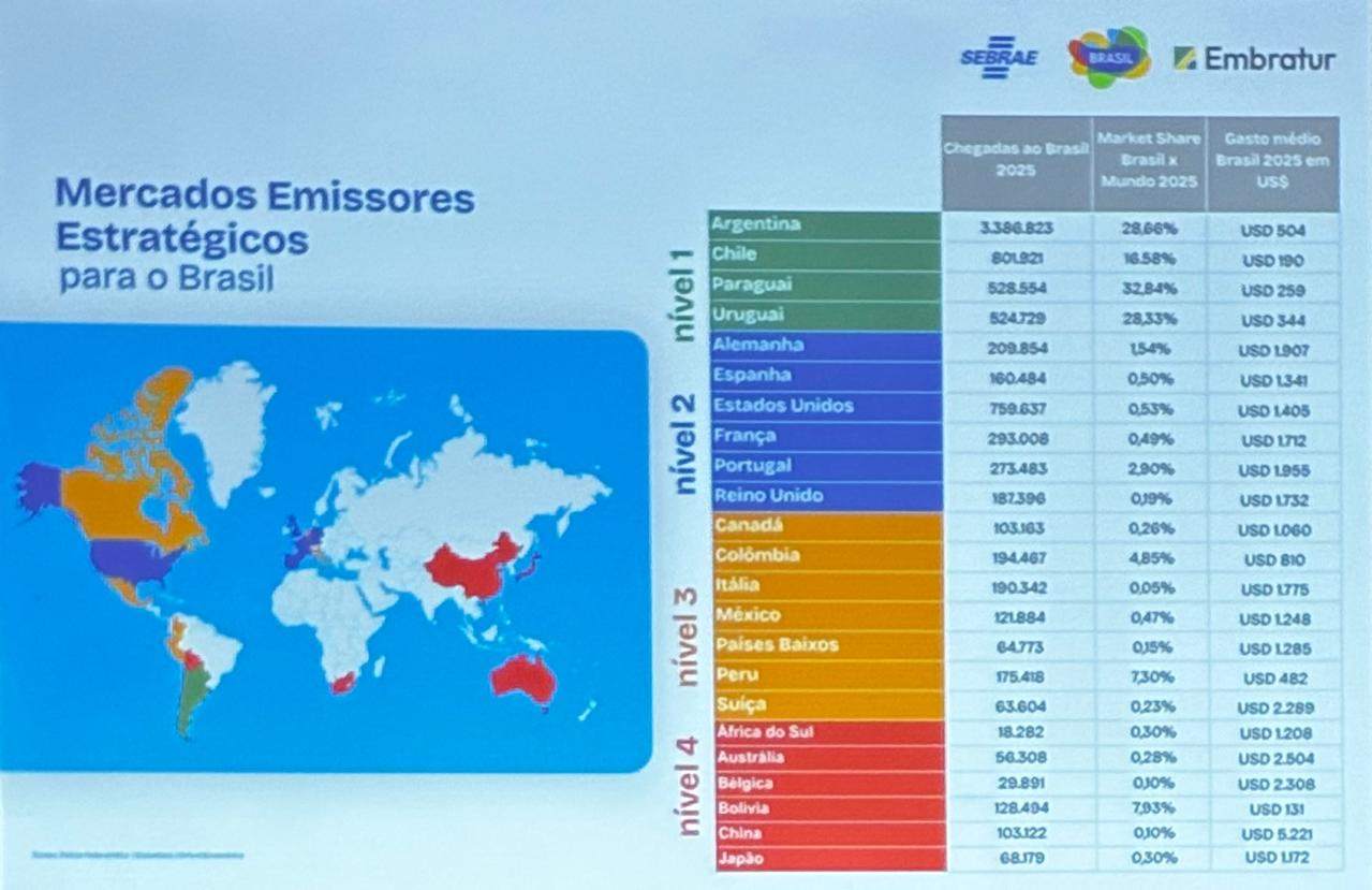 Ao longo da programação, foram divulgados os principais mercados no mundo e os gastos desses turistas no Brasil em 2025, onde alguns países da América do Sul se destacaram: Argentina (ticket médio de US$504 gasto por turista); Chile (US$190); Paraguai (US$ 259); Uruguai (US$344); Colômbia (US$810); Peru (US$482); e Bolívia (US$131).