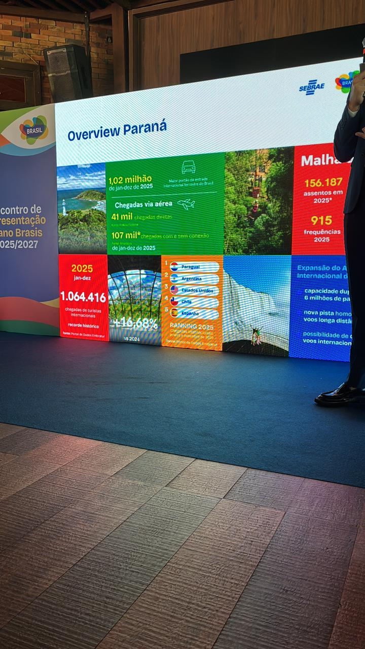 Mais de US$ 320 milhões, convertendo, mais de R$ 1,7 bilhão. Esse é valor estimado que foi injetado no Paraná por meio de turistas de alguns dos principais países da América do Sul em 2025. O número é resultado do ticket médio de gastos feitos por esses viajantes no Brasil ano passado, divulgados pela Agência Brasileira de Promoção Internacional do Turismo (Embratur) em parceria com o Sebrae, durante evento em Foz do Iguaçu, no Oeste, nesta sexta-feira (20).